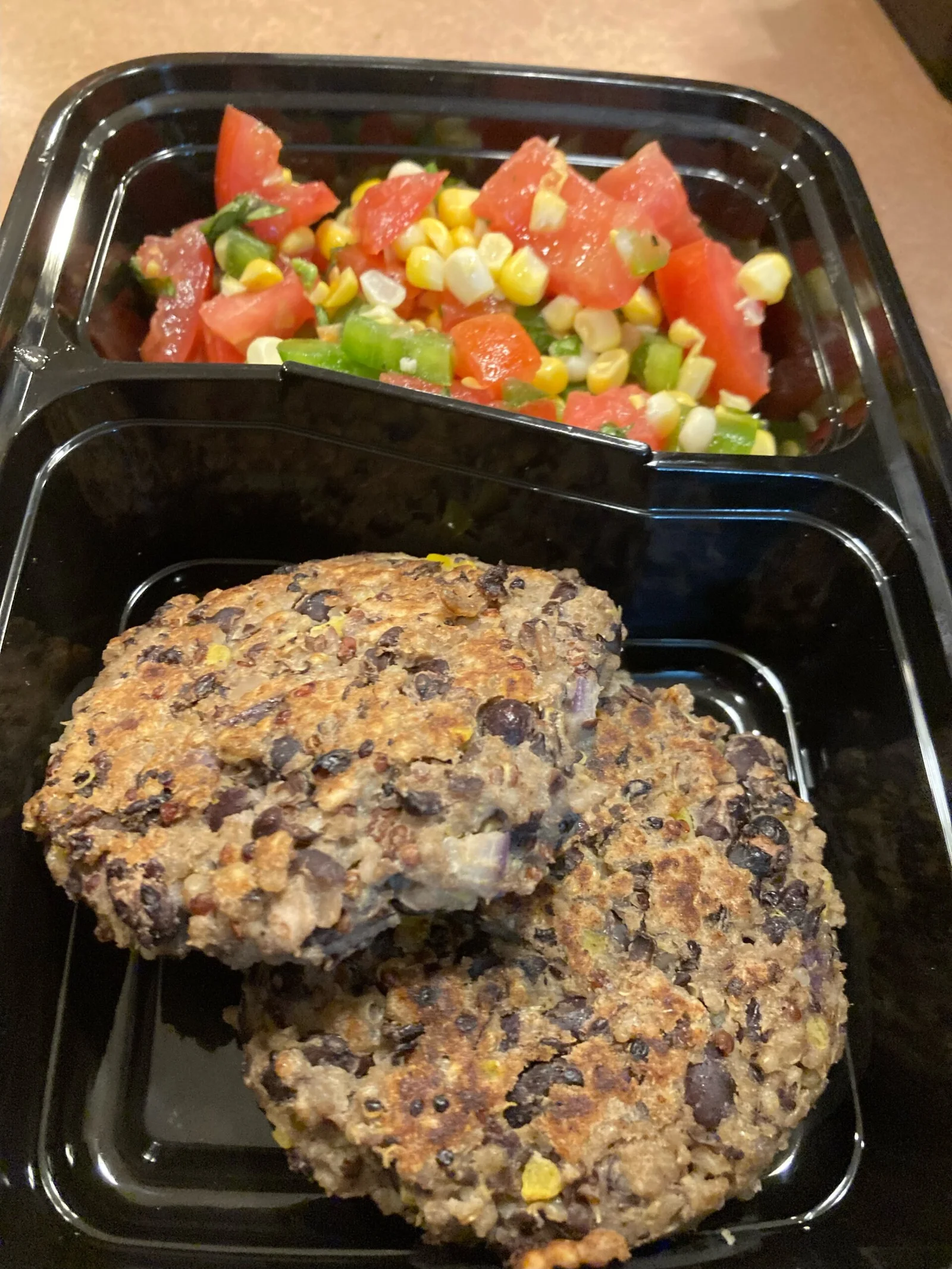 Burgers: Quinoa, Black Beans, Red Peppers, Red Onion, Egg, Gluten Free Breadcrumbs, Seasoning